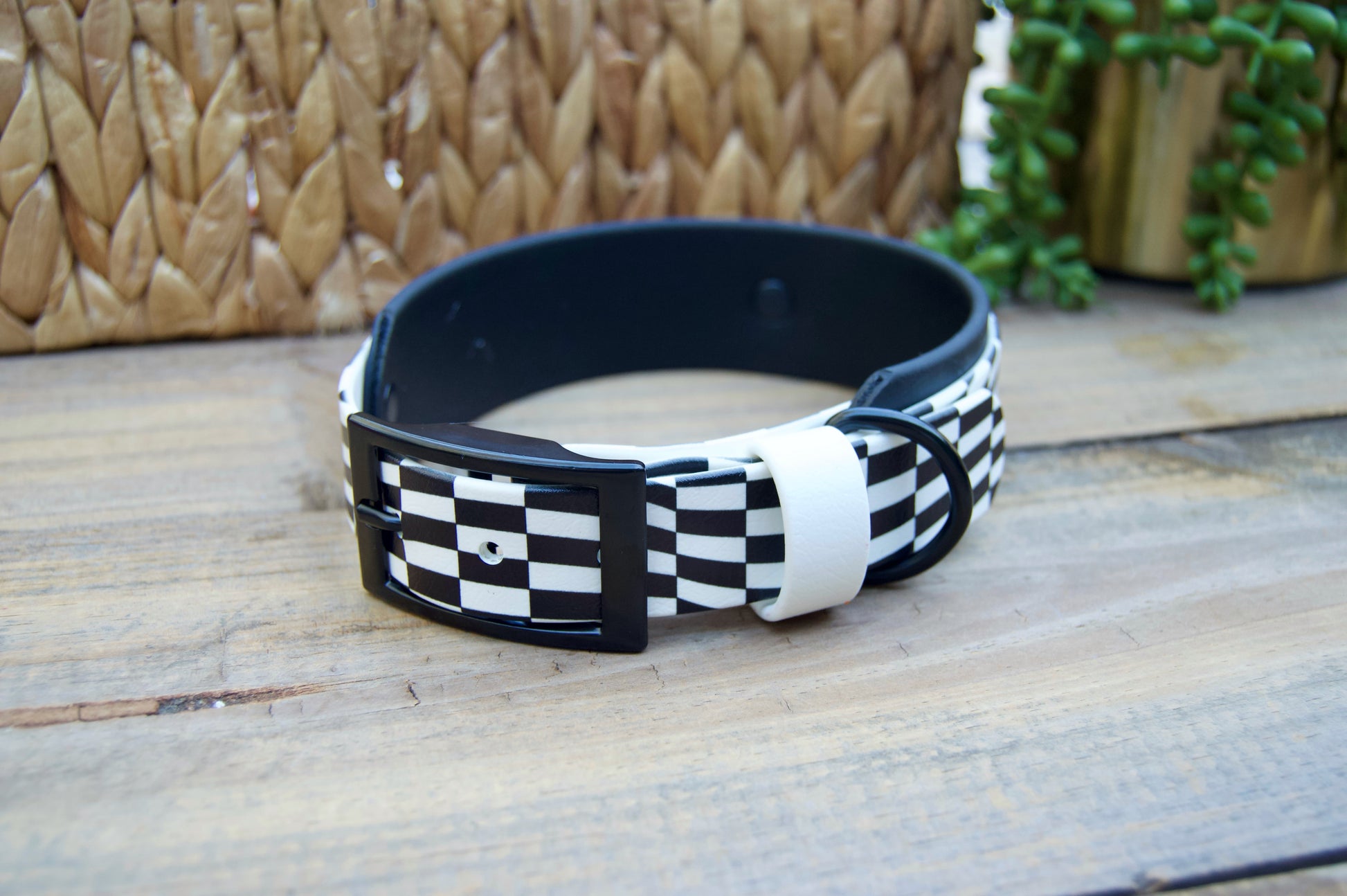 Closeout: Black and White Wavy Checker Printed Double Layer Biothane Dog Collar